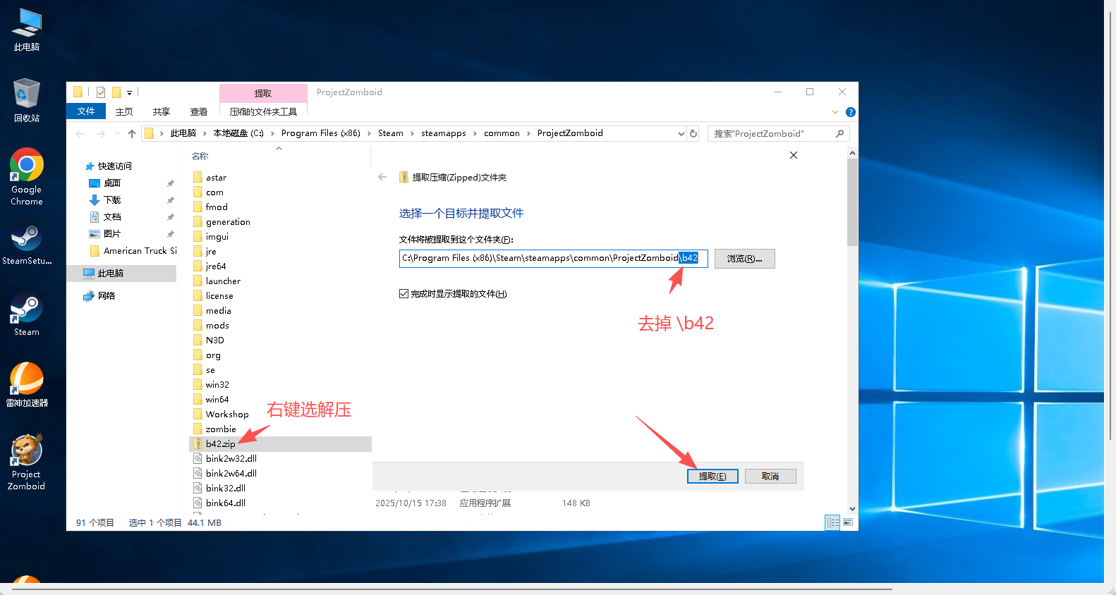 在解压的时候,去掉路径上的 \b42 再点击提取