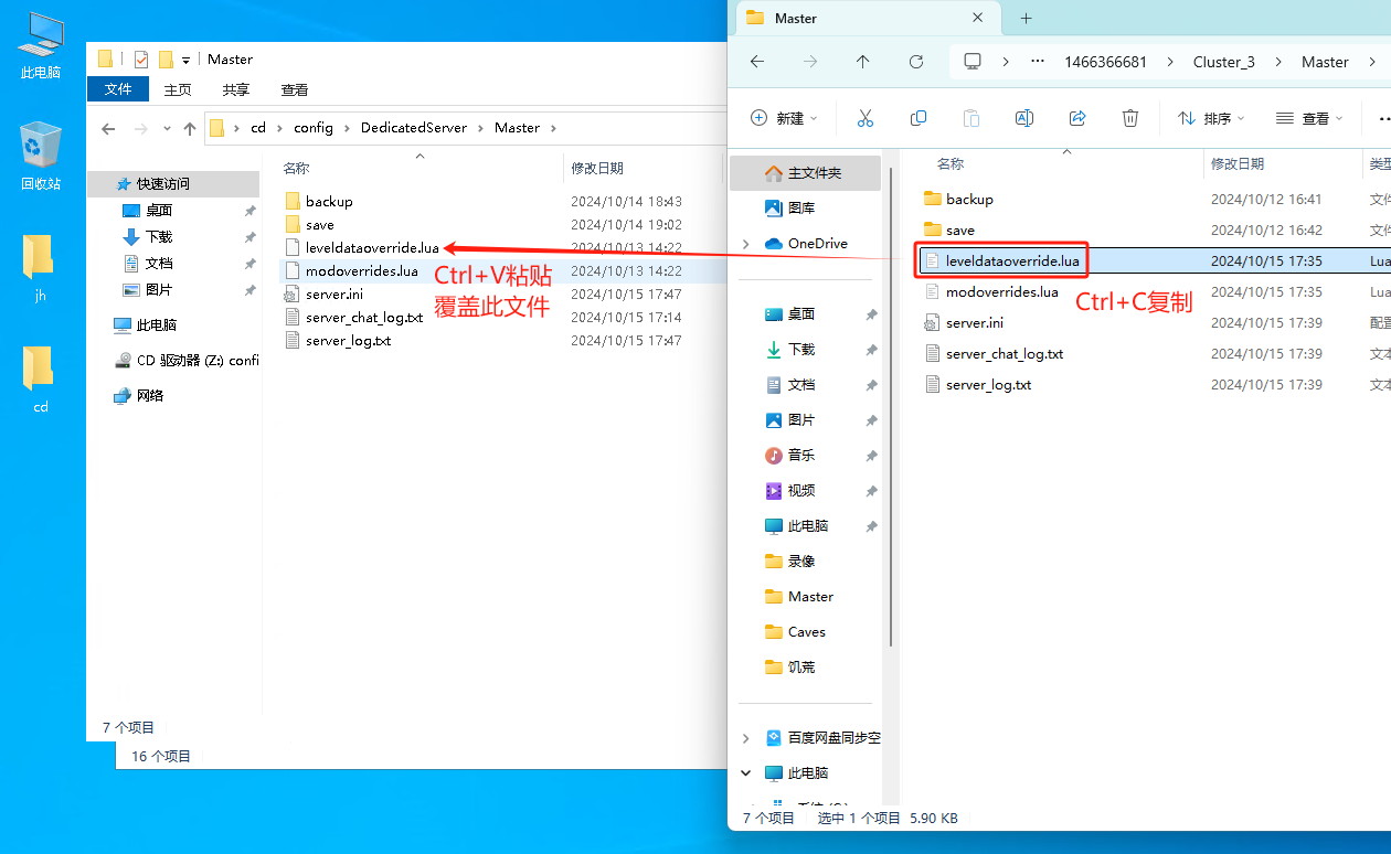然后将你的电脑上的leveldataoverride.lua和server.ini文件复制粘贴到服务器内进行覆盖