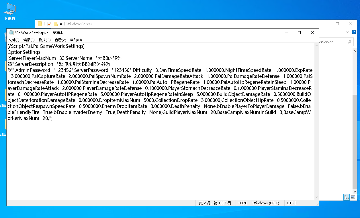 OptionSettings=(Difficulty=None,RandomizerType=None,RandomizerSeed="",DayTimeSpeedRate=1.000000,NightTimeSpeedRate=1.000000,ExpRate=1.000000,PalCaptureRate=1.000000,PalSpawnNumRate=1.000000,PalDamageRateAttack=1.000000,PalDamageRateDefense=1.000000,PlayerDamageRateAttack=1.000000,PlayerDamageRateDefense=1.000000,PlayerStomachDecreaceRate=1.000000,PlayerStaminaDecreaceRate=1.000000,PlayerAutoHPRegeneRate=1.000000,PlayerAutoHpRegeneRateInSleep=1.000000,PalStomachDecreaceRate=1.000000,PalStaminaDecreaceRate=1.000000,PalAutoHPRegeneRate=1.000000,PalAutoHpRegeneRateInSleep=1.000000,BuildObjectHpRate=1.000000,BuildObjectDamageRate=1.000000,BuildObjectDeteriorationDamageRate=1.000000,CollectionDropRate=1.000000,CollectionObjectHpRate=1.000000,CollectionObjectRespawnSpeedRate=1.000000,EnemyDropItemRate=1.000000,DeathPenalty=All,bEnablePlayerToPlayerDamage=False,bEnableFriendlyFire=False,bEnableInvaderEnemy=True,bActiveUNKO=False,bEnableAimAssistPad=True,bEnableAimAssistKeyboard=False,DropItemMaxNum=3000,DropItemMaxNum_UNKO=100,BaseCampMaxNum=128,BaseCampWorkerMaxNum=15,DropItemAliveMaxHours=1.000000,bAutoResetGuildNoOnlinePlayers=False,AutoResetGuildTimeNoOnlinePlayers=72.000000,GuildPlayerMaxNum=20,BaseCampMaxNumInGuild=4,PalEggDefaultHatchingTime=72.000000,WorkSpeedRate=1.000000,AutoSaveSpan=30.000000,bIsMultiplay=False,bIsPvP=False,bHardcore=False,bPalLost=False,bCanPickupOtherGuildDeathPenaltyDrop=False,bEnableNonLoginPenalty=True,bEnableFastTravel=True,bIsStartLocationSelectByMap=True,bExistPlayerAfterLogout=False,bEnableDefenseOtherGuildPlayer=False,bInvisibleOtherGuildBaseCampAreaFX=False,bBuildAreaLimit=False,ItemWeightRate=1.000000,CoopPlayerMaxNum=4,ServerPlayerMaxNum=32,ServerName="大BB的服务器",ServerDescription="欢迎来到大BB的服务器游戏",AdminPassword="",ServerPassword="",PublicPort=8211,PublicIP="",RCONEnabled=False,RCONPort=25575,Region="",bUseAuth=True,BanListURL="https://api.palworldgame.com/api/banlist.txt",RESTAPIEnabled=False,RESTAPIPort=8212,bShowPlayerList=False,ChatPostLimitPerMinute=10,AllowConnectPlatform=Steam,bIsUseBackupSaveData=True,LogFormatType=Text,SupplyDropSpan=180,EnablePredatorBossPal=True,MaxBuildingLimitNum=0,ServerReplicatePawnCullDistance=15000.000000)
