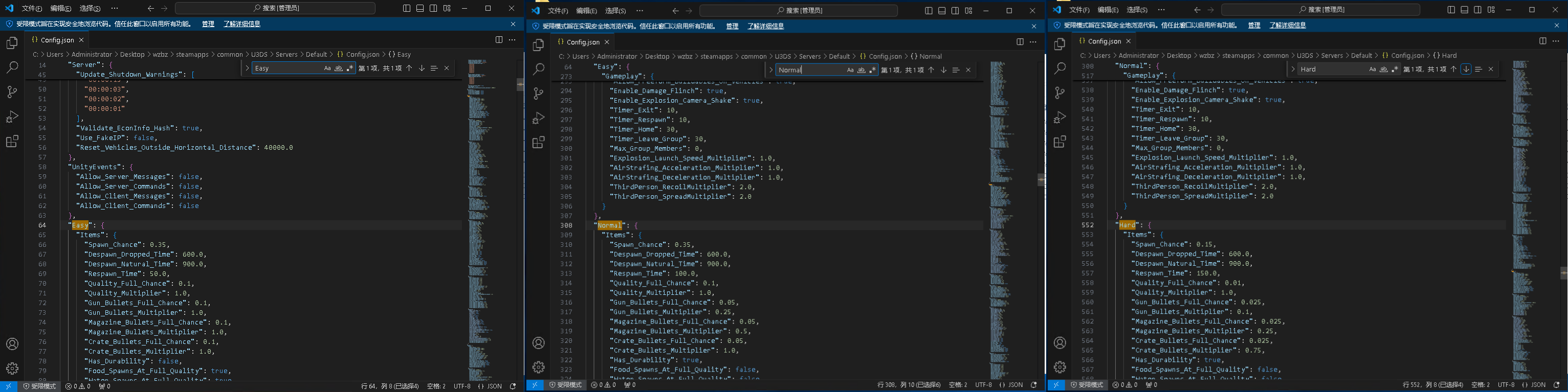 如上图中,设置的难度为Eazy,那么就去Config.json文件里修改Easy部分的参数