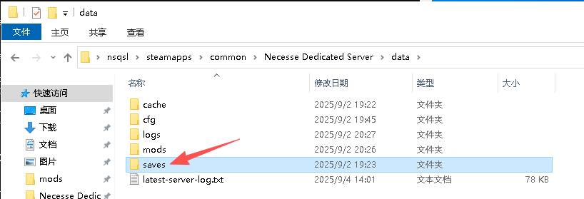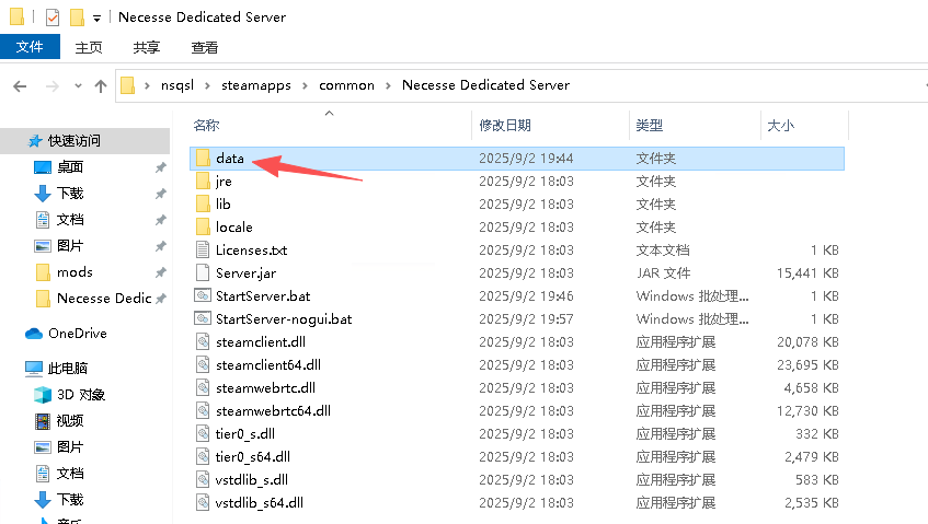 在服务器根目录Necesse Dedicated Server中打开data文件夹