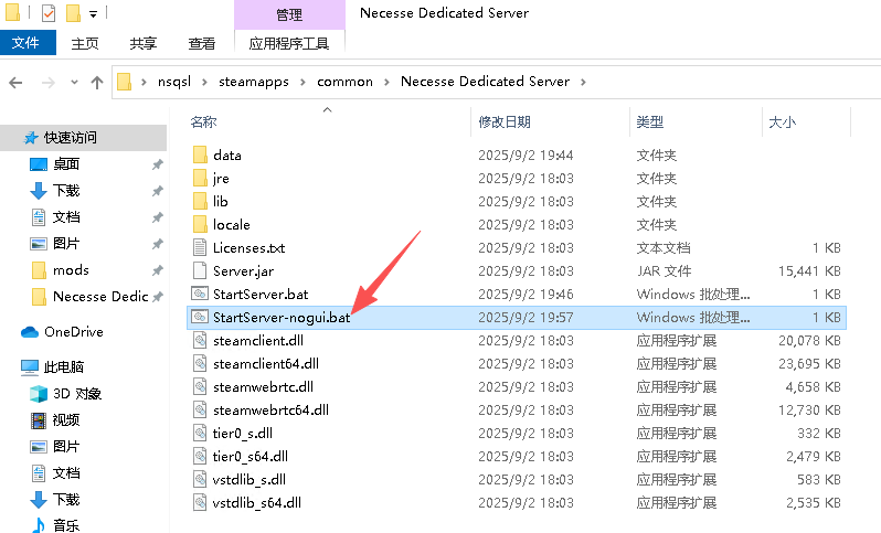 在服务器根目录Necesse Dedicated Server中双击StartServer-nogui.bat文件来运行你的模组服