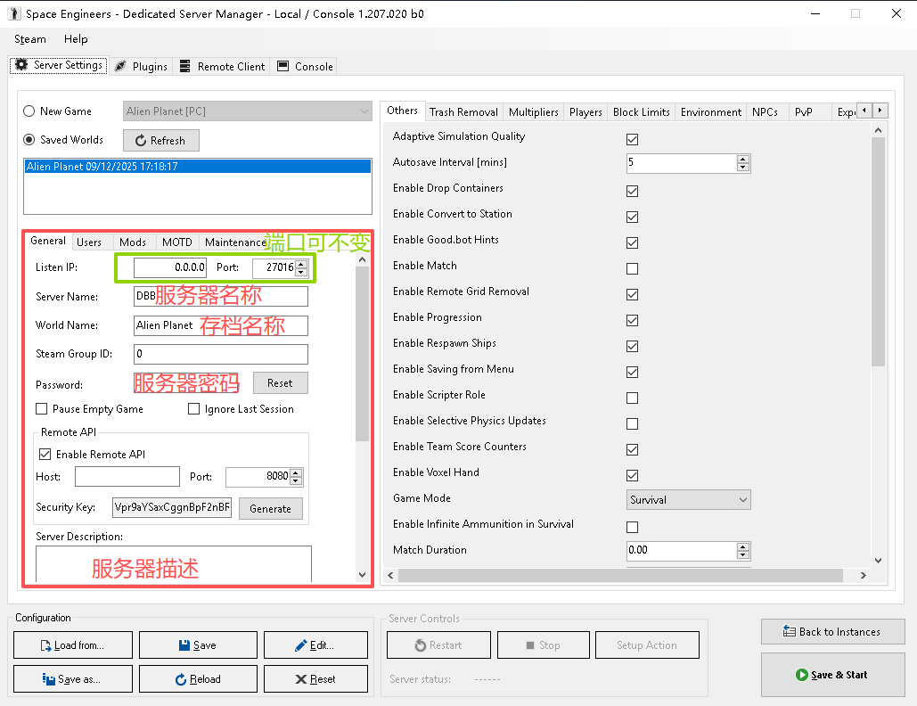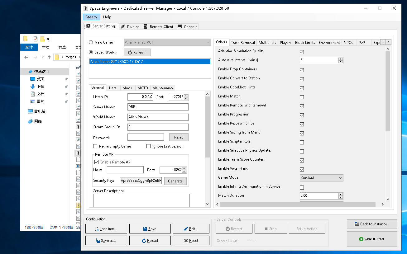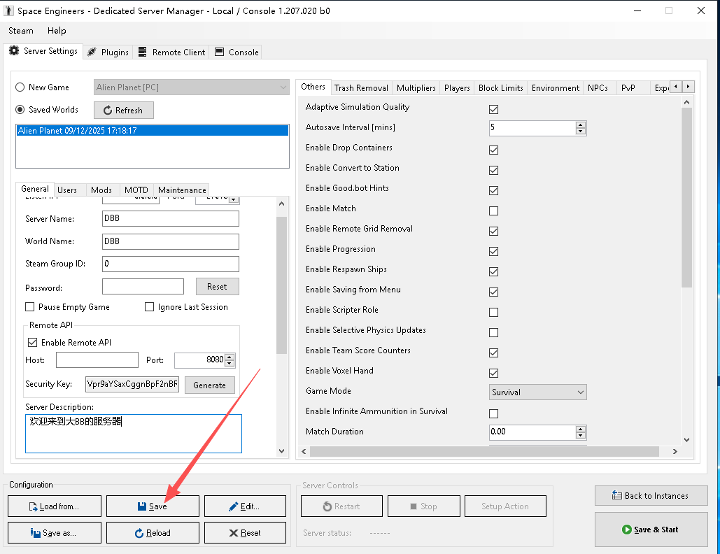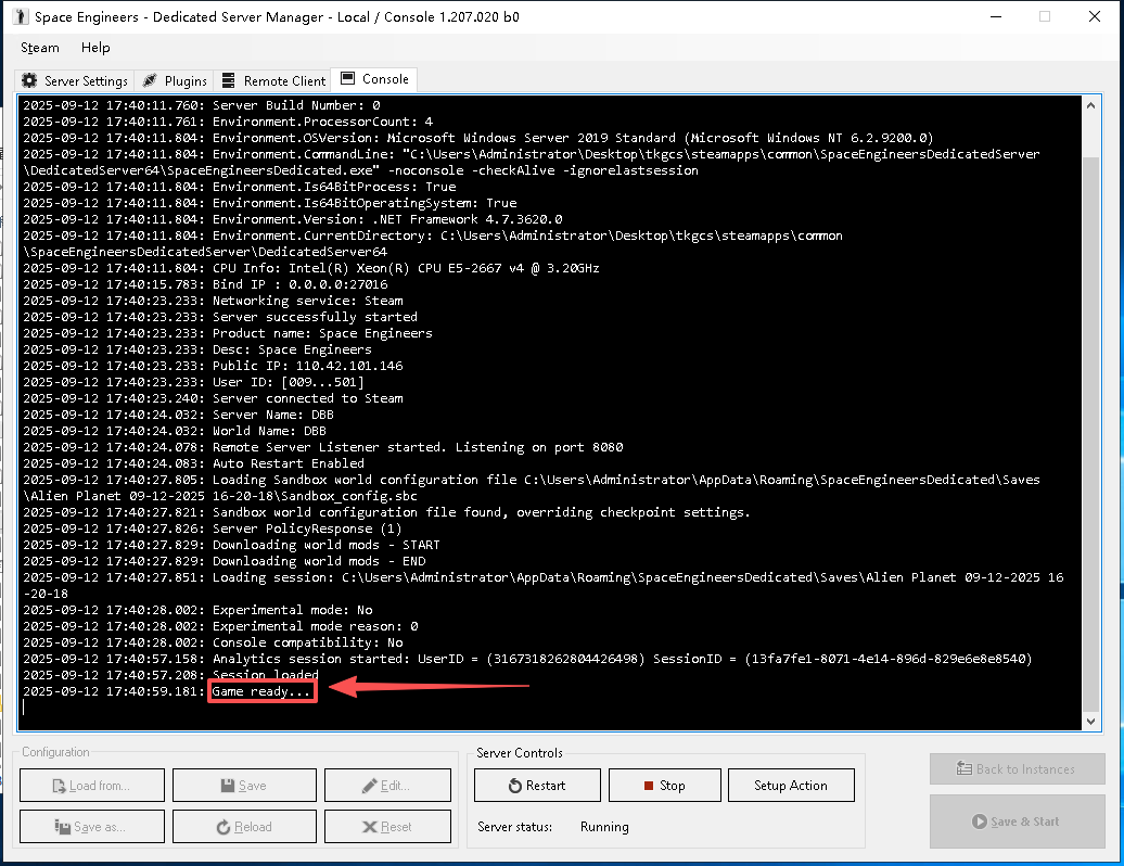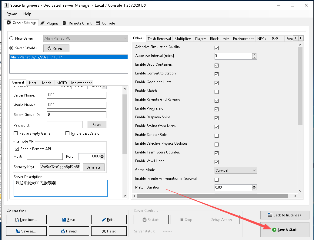 点击右下角的Save & Start就运行太空工程师专用服务器了