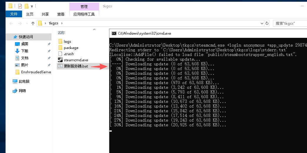 双击更新服务端.bat文件打开,等待他进行服务端安装