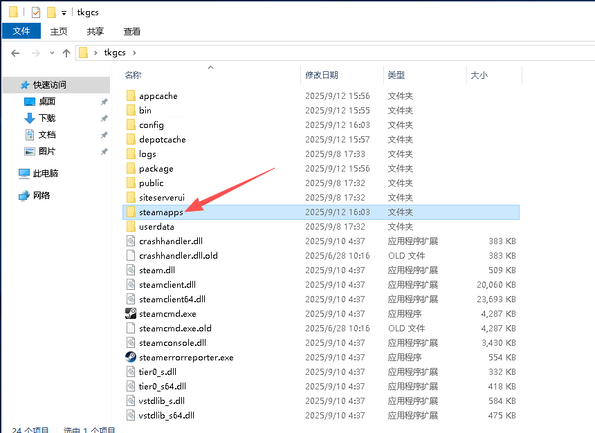 9、安装完成后在tkgcs文件夹内可以看到多出很多文件,根据以下顺序进入SpaceEngineersDedicatedServer文件夹内,也就是太空工程师服务器的根目录