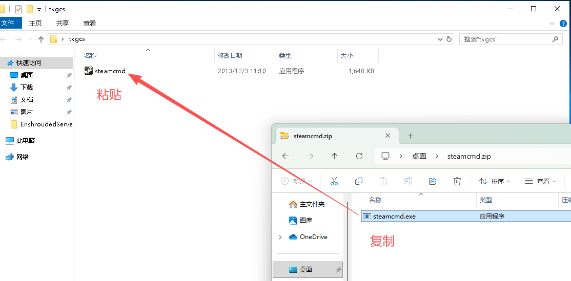5、在下载的SteamCMD压缩包里复制steamcmd.exe文件,粘贴到文件云服务器里的tkgcs文件夹内