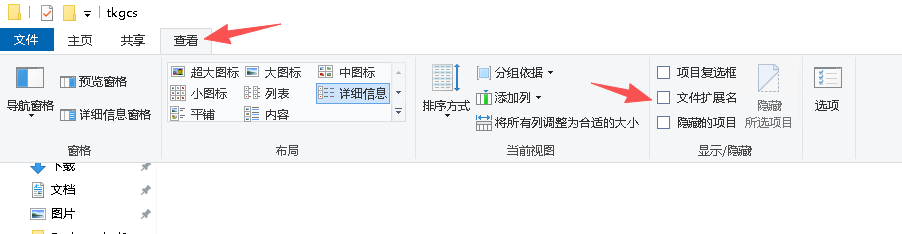 6、点击tkgcs文件夹上方的查看,然后勾选文件扩展名选项
