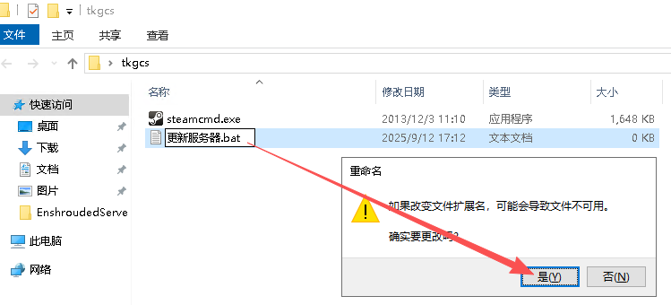 7、在tkgcs文件夹内创建一个文本文件,将名字新建文本文档.txt更改为更新服务端.bat(之后服务器端需要更新,再次运行这个脚本即可)