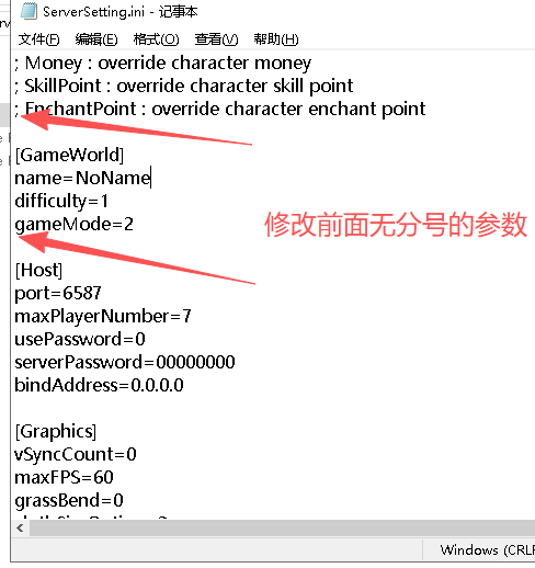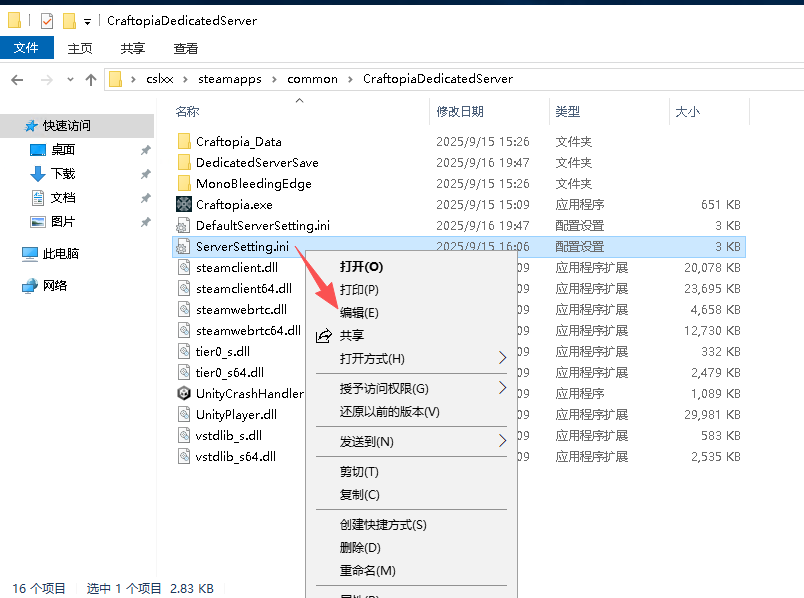 在创世理想乡专用服务器根目录CraftopaDedicatedServer文件夹中右键ServerSetting.ini文件选择编辑