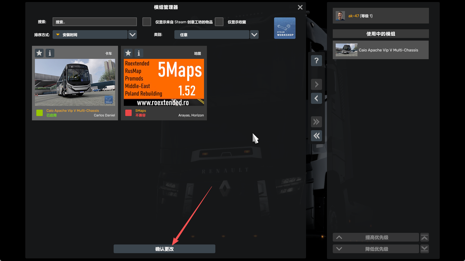 然后启用你的想玩的模组,并点击确定更改