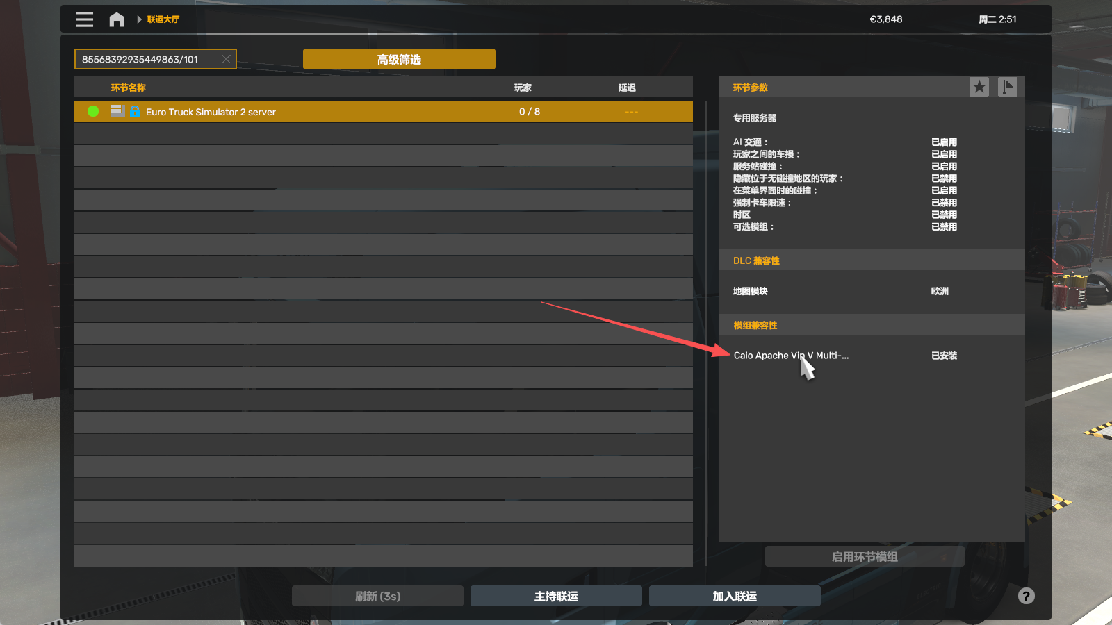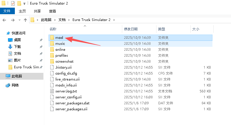 在Euro Truck Simulator 2文件夹里会有一个mod文件夹(这个就是服务器安装模组文件的位置)