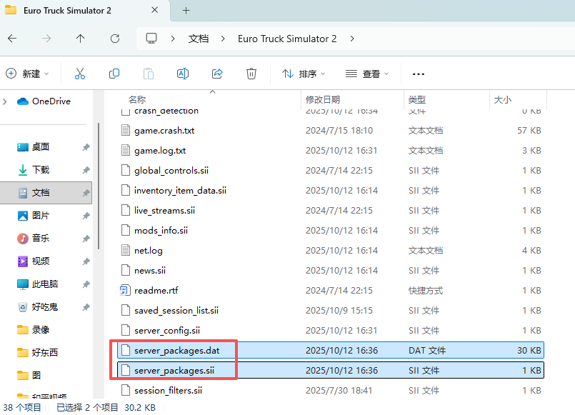 配置文件就是在Euro Truck Simulator 2文件夹里的 server_packages.sii 和 server_packages.dat 两个文件