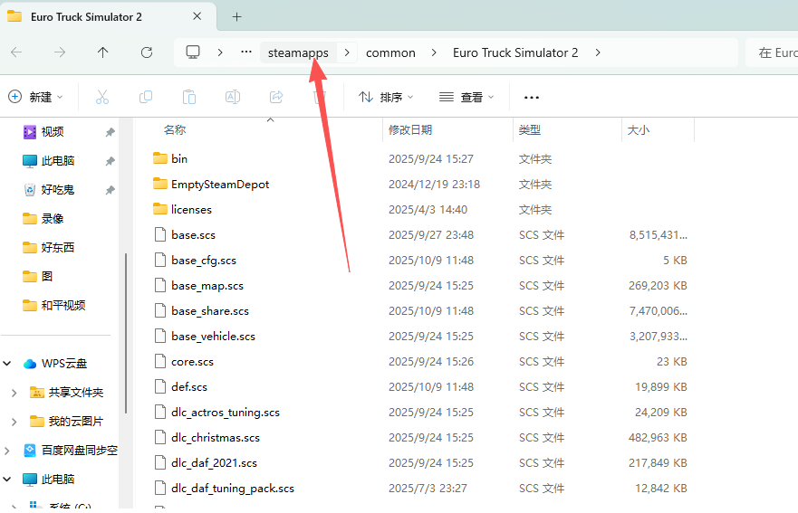 打开云服务器的Euro Truck Simulator 2文件夹(从你安装模组文件的mod文件夹中点击上方路径的Euro Truck Simulator 2就可以)