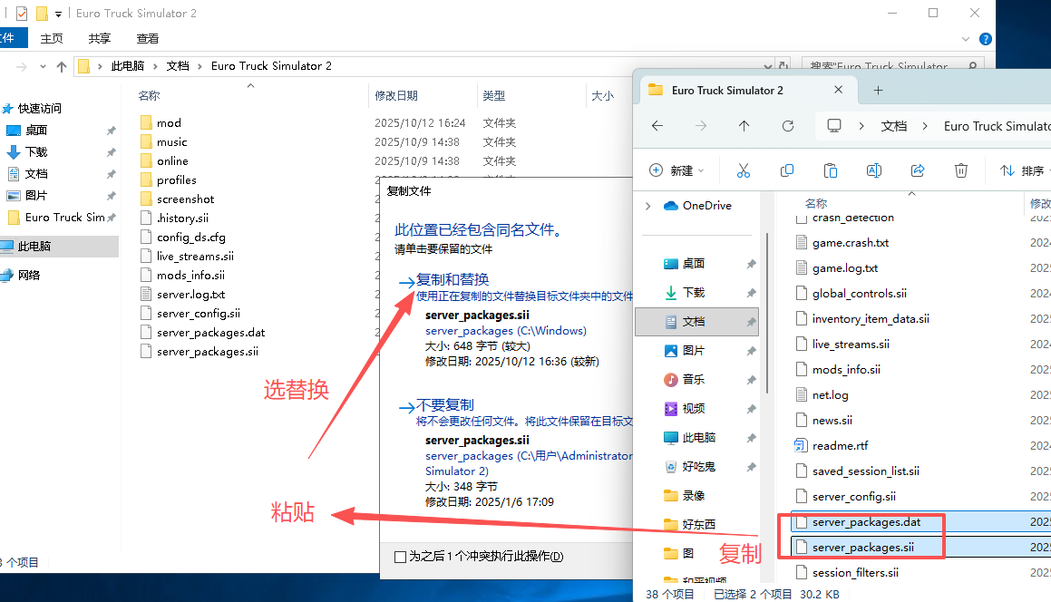 然后将客户端的 server_packages.sii 和 server_packages.dat 两个文件复制粘贴到云服务器的Euro Truck Simulator 2文件夹内
