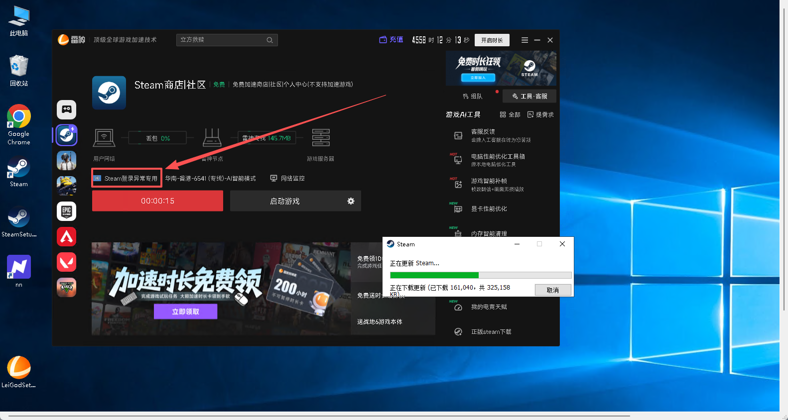 如果觉得steam更新比较慢就上传那个雷神安装包并安装,然后使用雷神加速器加速器steam商店,注意节点选择Steam登陆异常专用