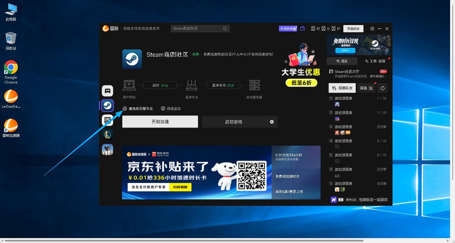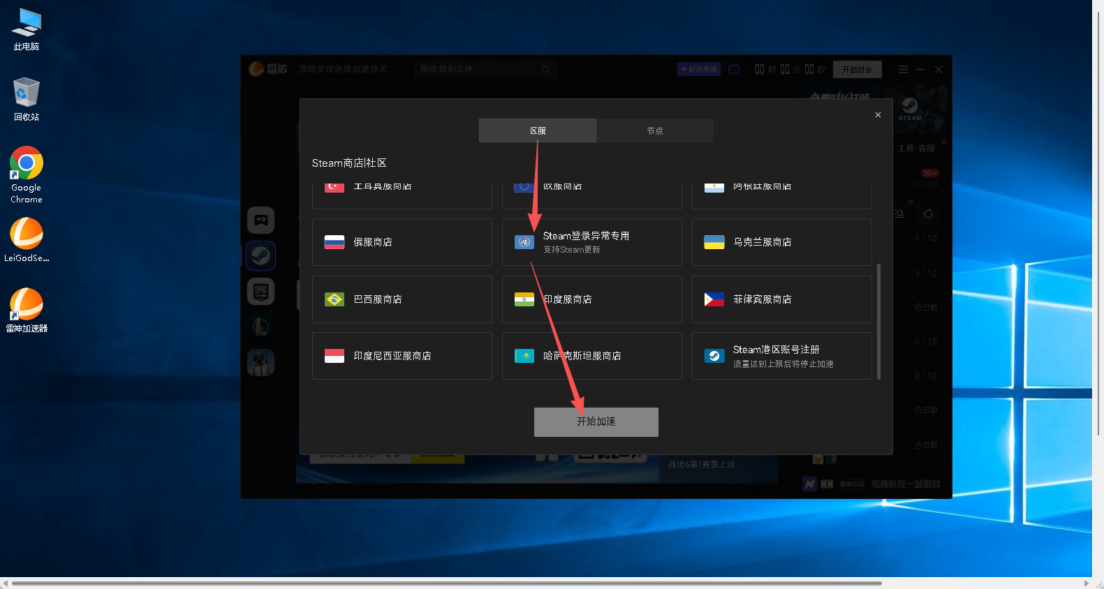 然后在【区服】中找到【Steam登录异常专用】,选择后点击开始加速