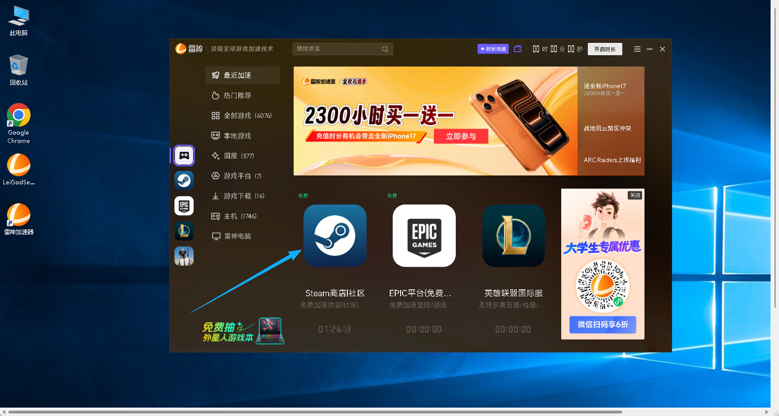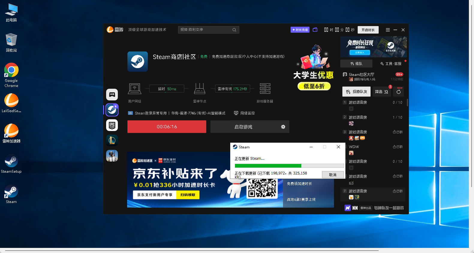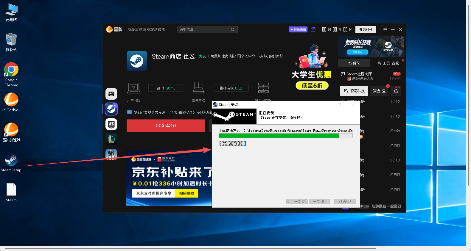 安装完成后运行steam(这里steam首次运行就会要求更新,雷神加速器就起到了大作用)