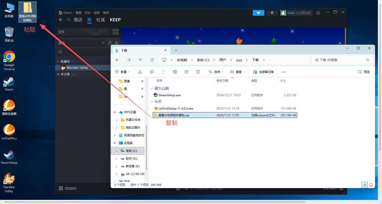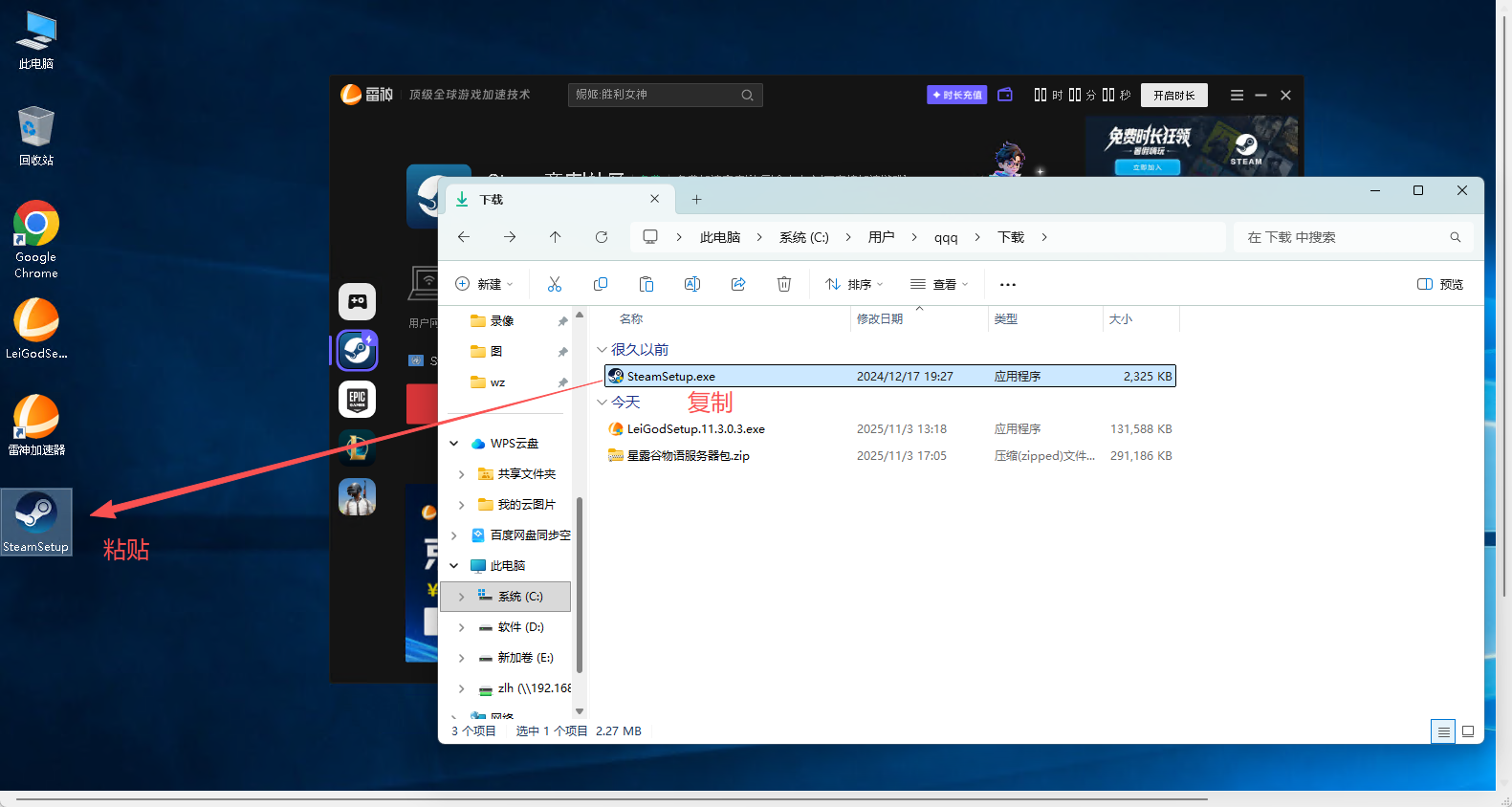 将你下载的steam安装包上传至云服务器(上传方式:复制粘贴)