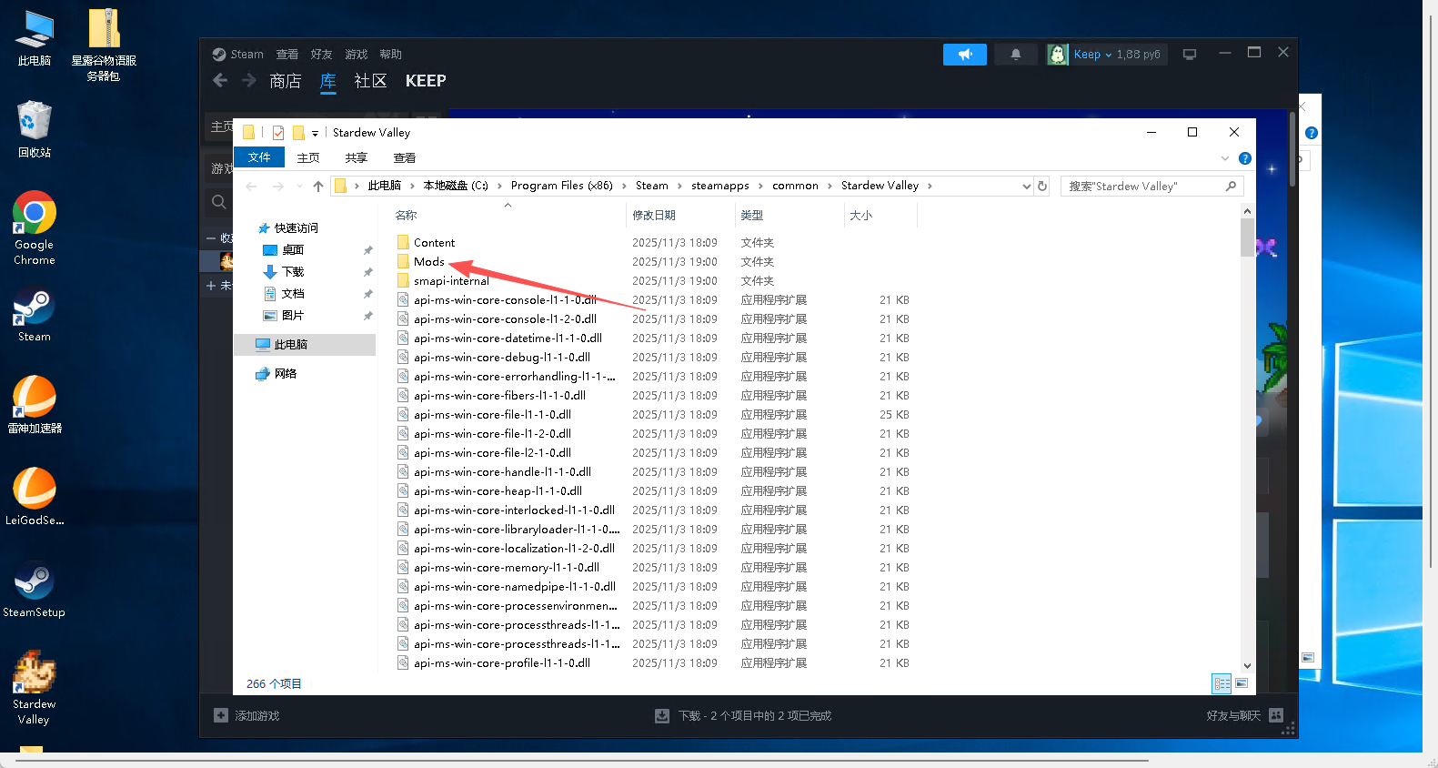 在弹出来的文件夹(游戏根目录)中会有一个Mods文件夹,双击打开它