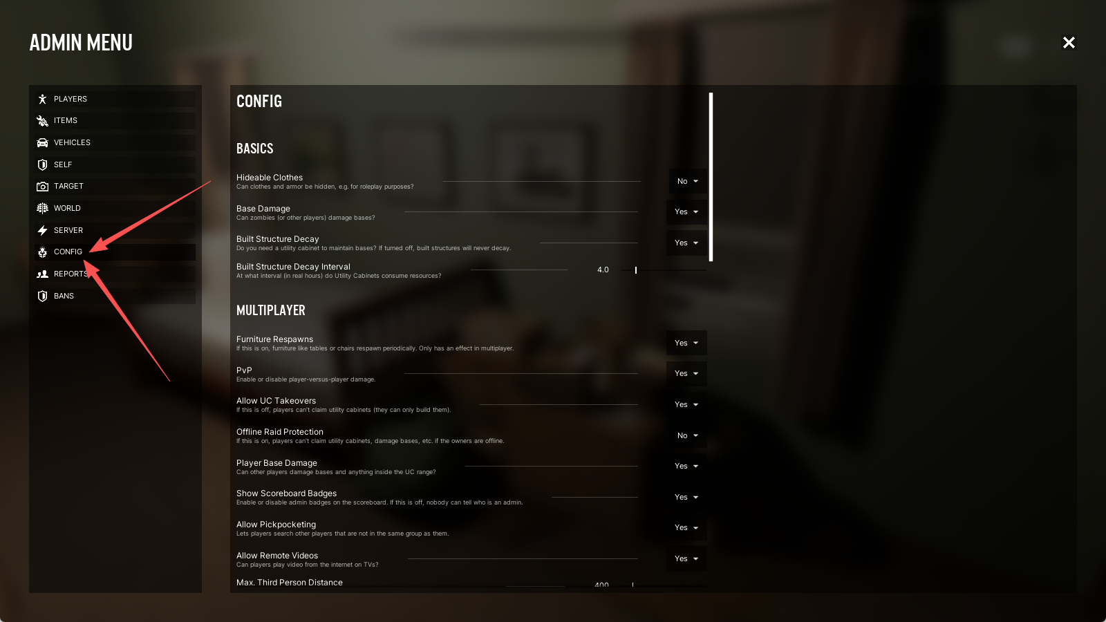 使用你添加了管理员权限的steam账号连接到服务器后,点击键盘删除键下方的反斜杠键【\】打开游戏的管理员面板(这是游戏默认按键,如果你有修改你一定知道你修改了哪个按键)