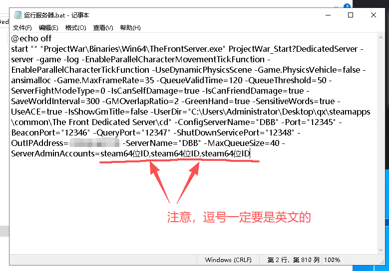 然后将你想给权限的管理员账号的Steam64位ID填上去,多位管理员就使用英文的逗号【,】分隔