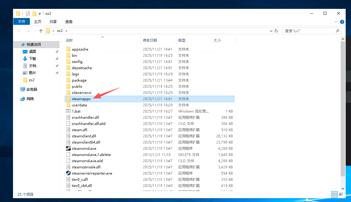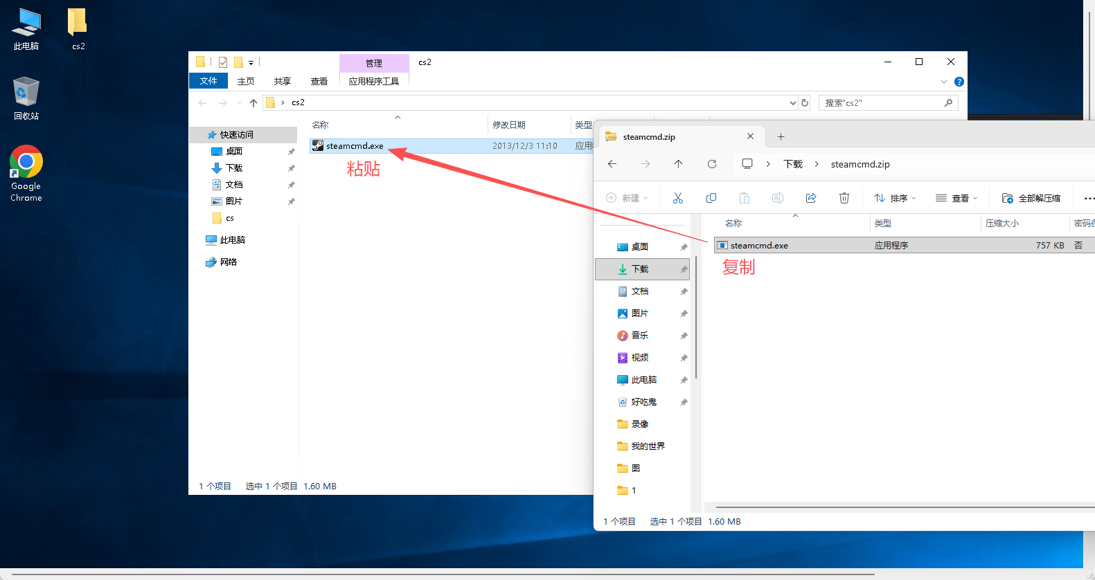 5.2、在下载的SteamCMD压缩包里复制steamcmd.exe文件,粘贴到文件云服务器里的cs2文件夹内