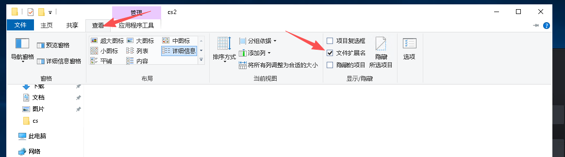 5.3、点击CS2文件夹上方的查看,然后勾选文件扩展名选项