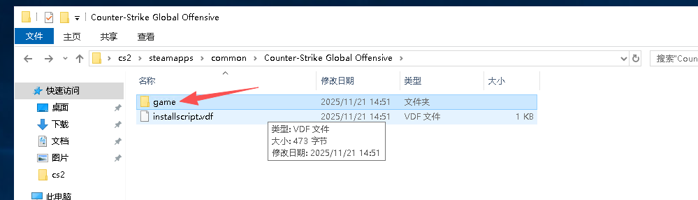 6.1、安装完成后在CS2文件夹内可以看到多出很多文件,根据以下顺序进入Counter-Strike Global Offensive文件夹内,也就是反恐精英服务器的根目录