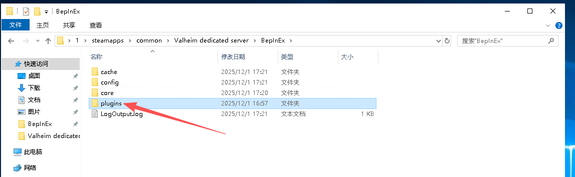 打开英灵神殿服务器根目录(Valheim dedicated server)里的【BepInEx】文件夹,在里面会有一个【plugins】文件夹(不要没运行服务器又说找不到对应的文件夹)