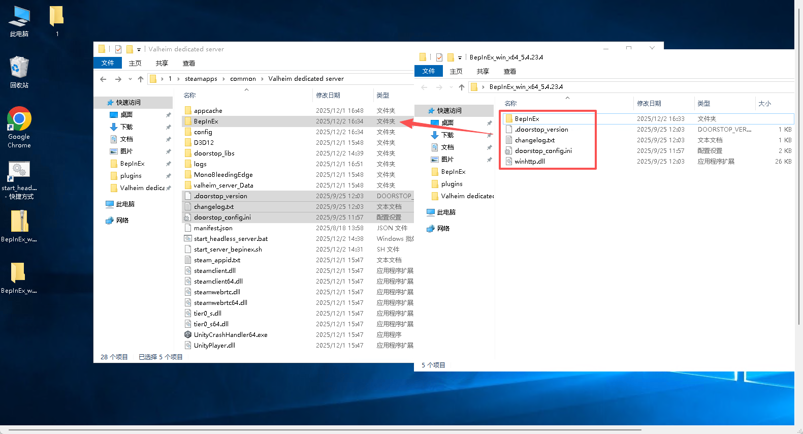 接着打开解压出来的模组前置包 和 你搭建的英灵神殿服务器根目录(Valheim dedicated server)