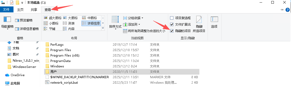 打开C盘,然后点击文件夹左上方的查看,并勾选隐藏的项目选项(因为AppData文件夹是隐藏文件)