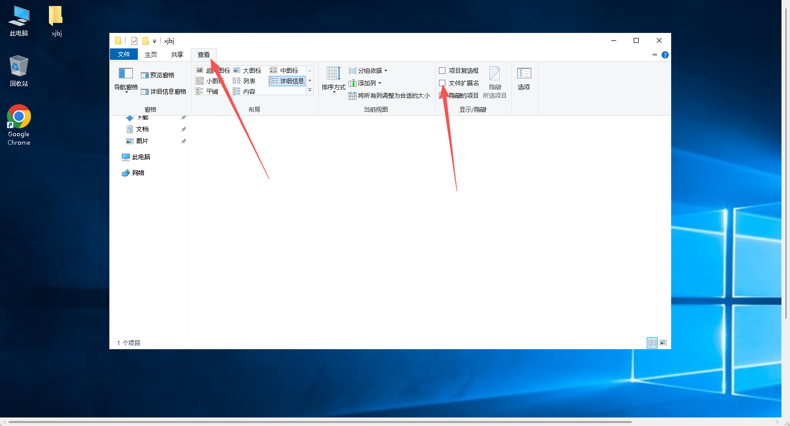 3.3、点击xjbj文件夹上方的查看,然后勾选文件扩展名选项