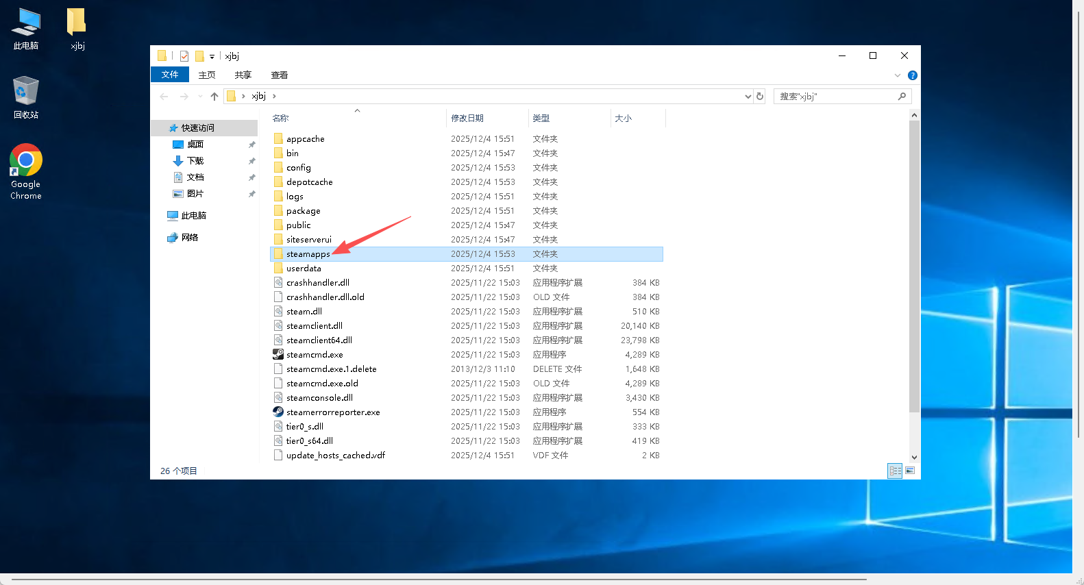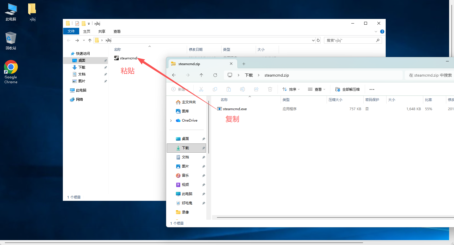 3.2、在下载的SteamCMD压缩包里复制steamcmd.exe文件,粘贴到你在云服务器里创建的文件夹内