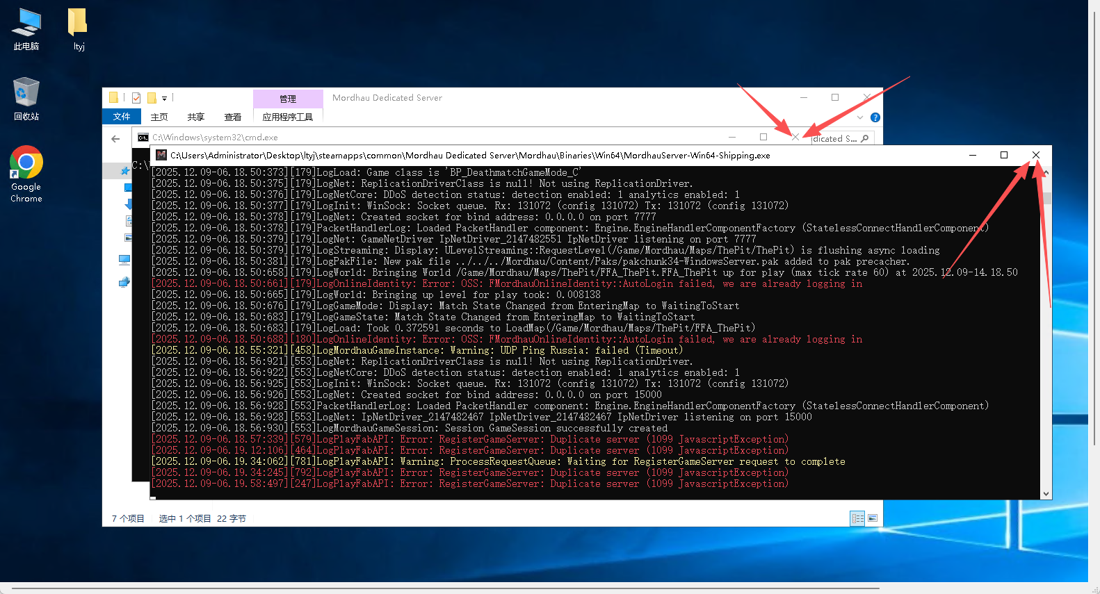 在出现的黑框中看到【Session GameSession successfully created】就说明服务器已经运行起来了