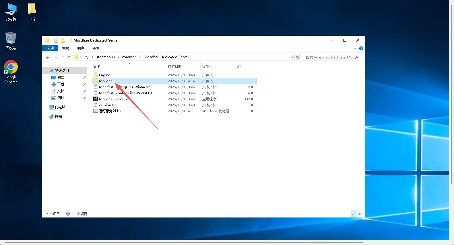 4.1、根据以下顺序进入【Mordhau Dedicated Server】文件夹内,也就是雷霆一击服务器的根目录