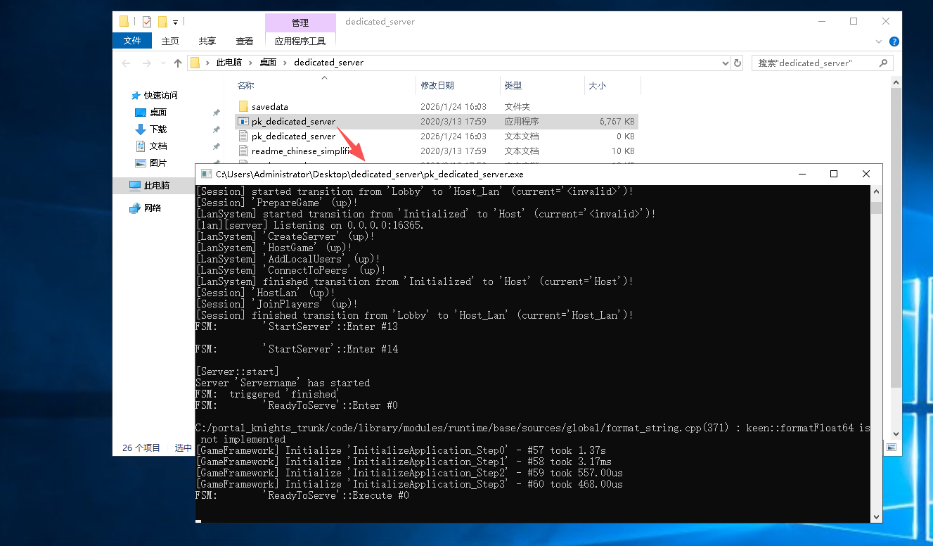 4.2、直接双击【pk_dedicated_server】文件就可以运行传送门骑士(出现的黑框不要关,那是传送门游戏的服务器,关闭黑框代表关服)