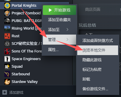 3.1、右键你Steam里的传送门骑士游戏➡鼠标移至管理➡选择浏览本地文件