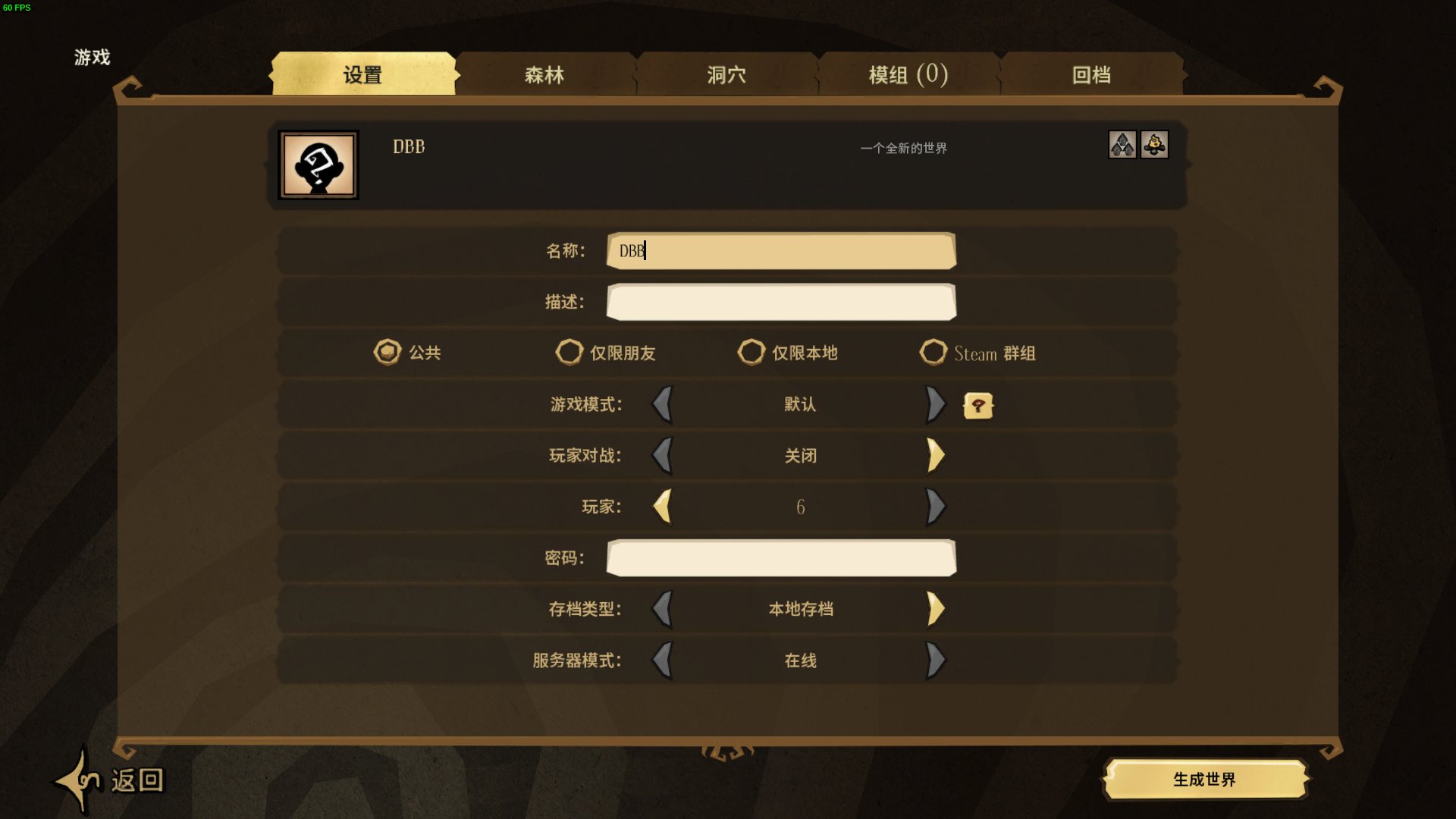 创建游戏的时候设置服务器信息和你想要的世界规则,是否生成洞穴地图等内容