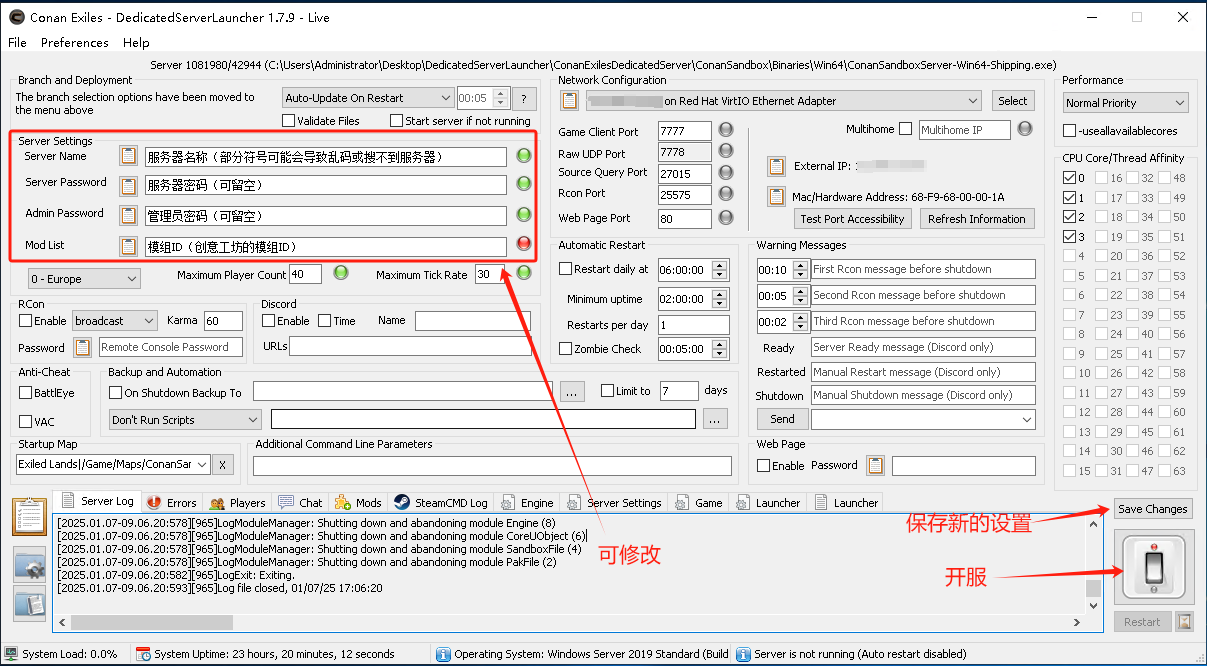设置好信息后,一定要先点右下角的Save Changes先保存一遍你的设置,然后再点开关开启服务器