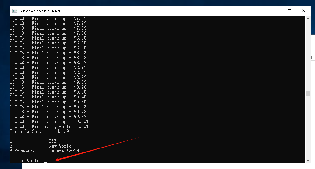 5、当黑框出现Choose World:之后就可以开始操作了,(这是创建存档的步骤,如果你需要上传你自己的存档进行游戏请看此教程,以下可6~11步骤可以跳过了👉【泰拉瑞亚原版(Terraria)服务器使用自己存档教程】)