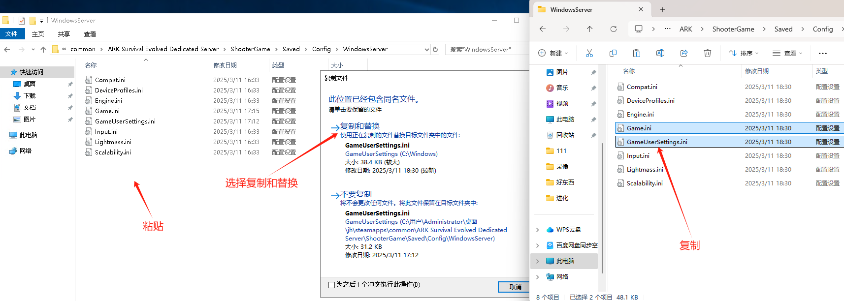 将你本地的Game.ini和GameUserSettings.ini文件复制,然后粘贴到云服务器的WindowsServer文件夹内
