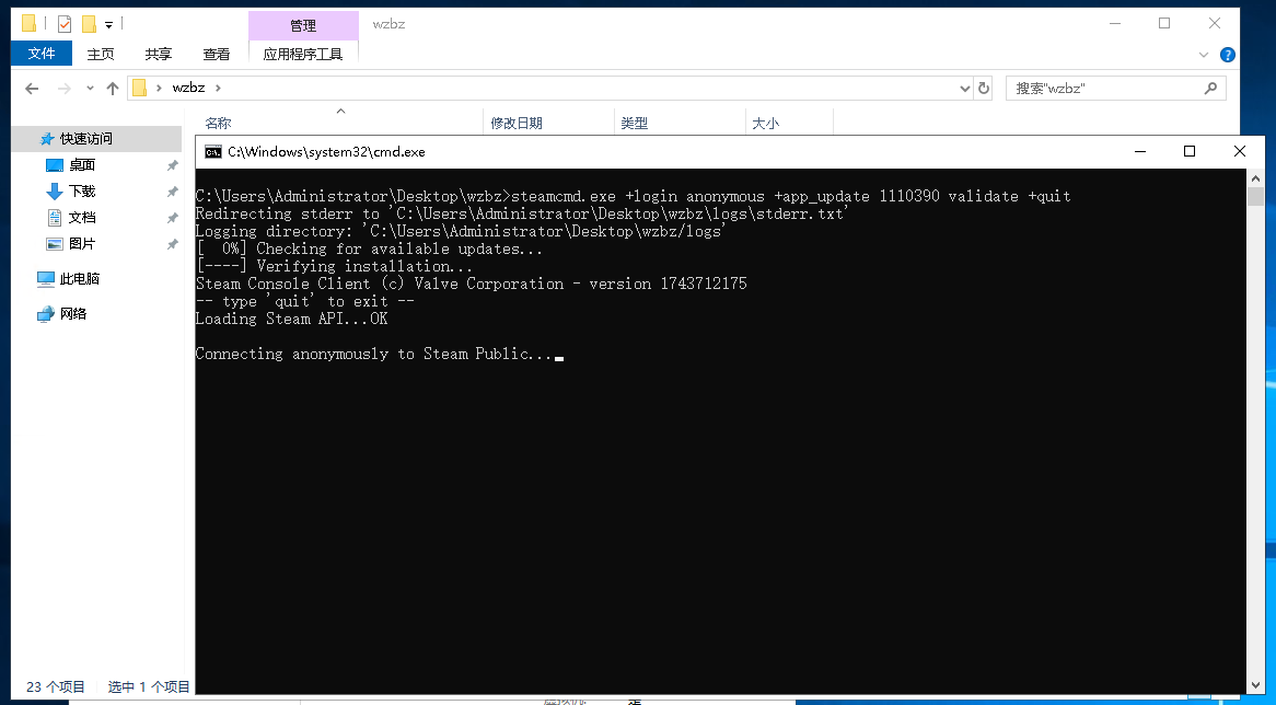 steamcmd.exe +login anonymous +app_update 1110390 validate +quit7、双击更新服务器.bat文件打开,等待他进行服务端安装