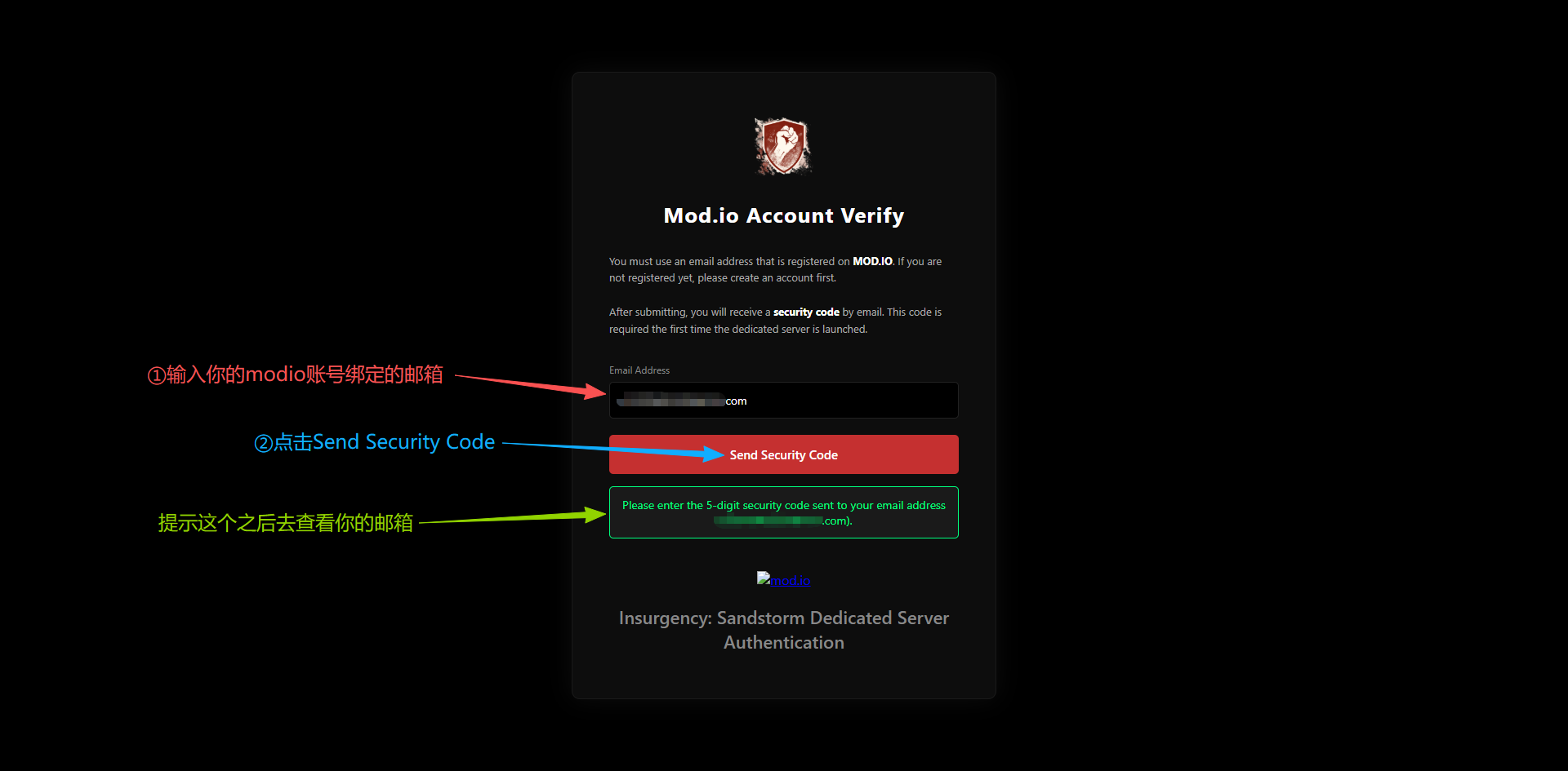 将你新建的没有任何服务器和游戏绑定使用的 Mod.io 账户邮箱填写进去并点击【Send Security Code】,官方就会往你的邮箱内发送授权码