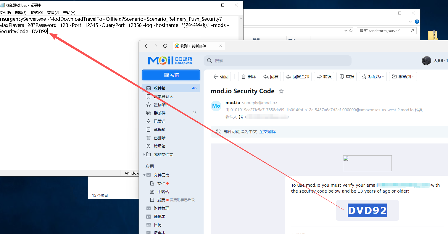 保存文件后去双击获取授权码.bat执行一次,然后在出现的黑框中输入你新建的没有任何服务器和游戏绑定使用的 Mod.io 账户邮箱