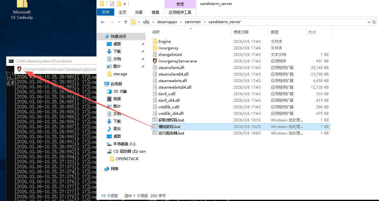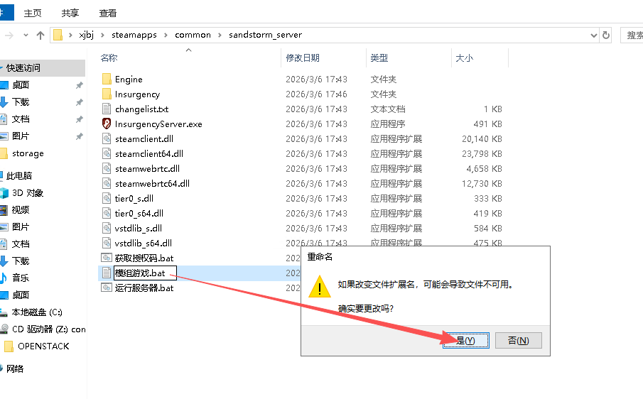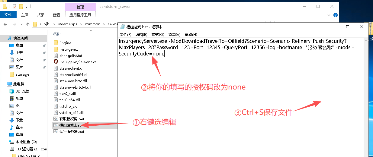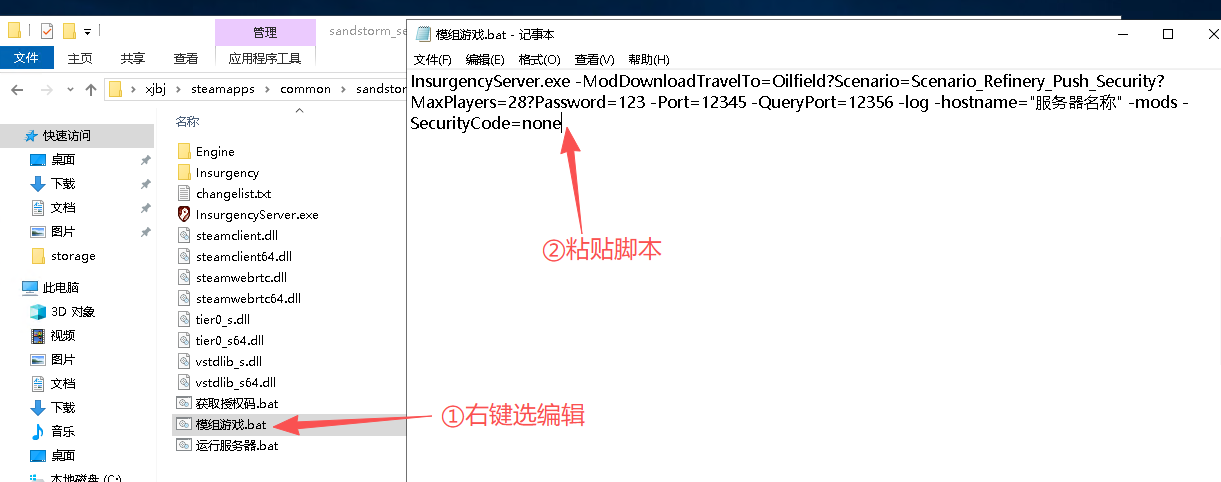 在你的叛乱服务器根目录【sandstorm_server】脚本中创建一个新的文本文档,将其重命名为模组游戏.bat