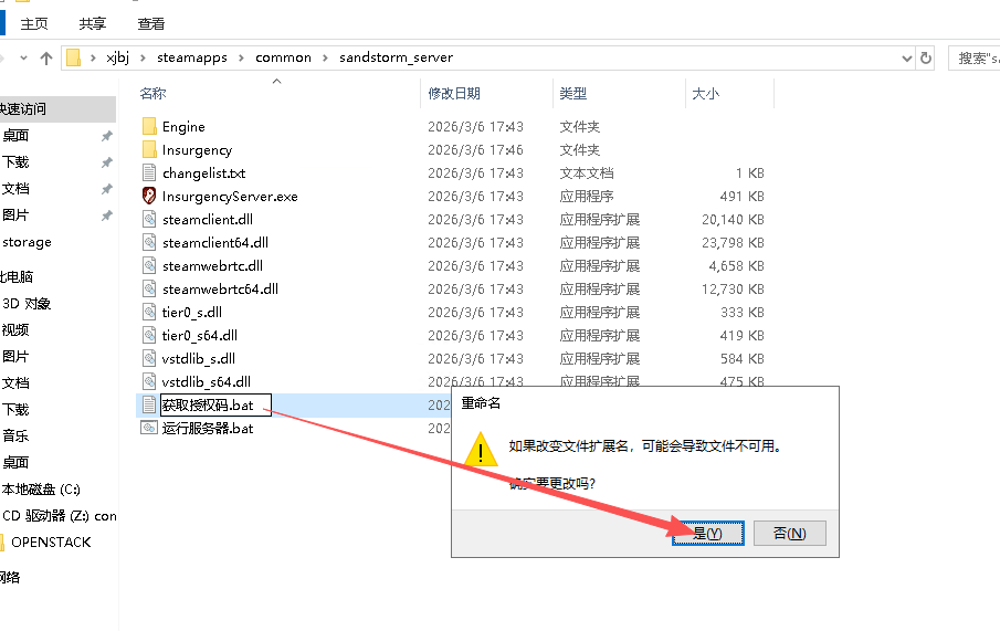 在你的叛乱服务器根目录【sandstorm_server】脚本中创建一个新的文本文档,将其重命名为获取授权码.bat