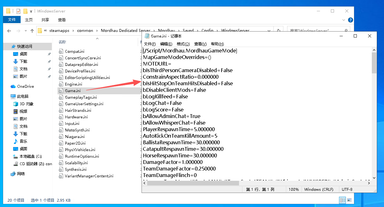 从你打搭建的雷霆一击服务器根目录【Mordhau Dedicated Server】文件夹开始,根据以下路径找到【Game.ini】文件