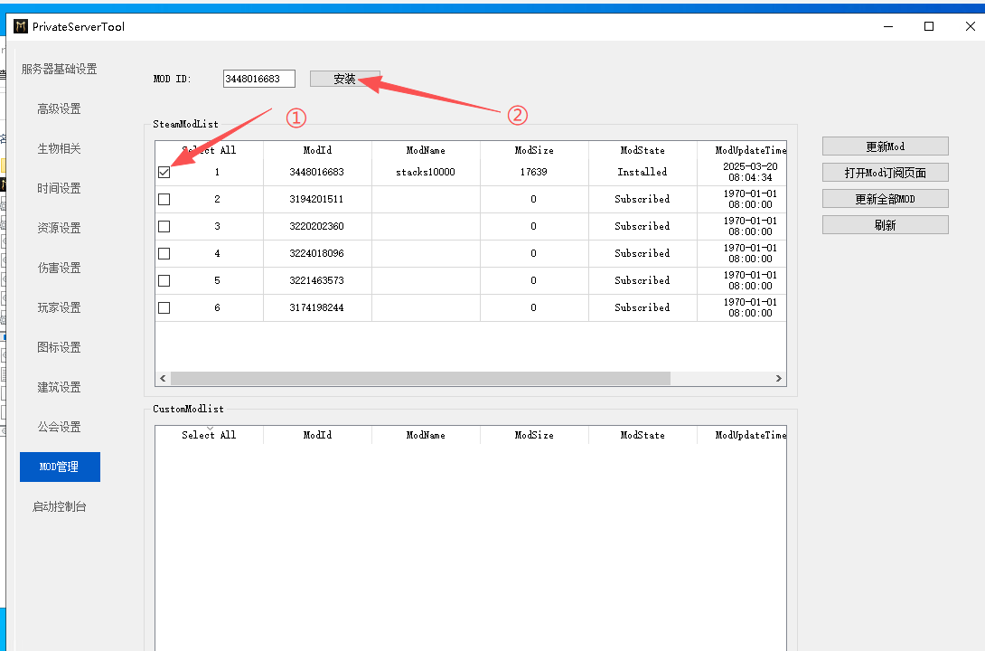下载steam安装包👉【steam官网】下载雷神加速器安装包👉【雷神官网】(可以不是雷神,其他的也可以)给你的云服务器安装上steam 并登录你的帝国神话账号(不需要安装游戏)在订阅模组之前要把官方的工具【PrivateServerTool.exe】关掉然后自行在创意工坊中订阅你想玩的模组然后再去打开工具【PrivateServerTool.exe】在工具中点击MOD管理,点击刷新,你就能看到你的订阅的所有模组接着选择你想要玩的模组,点击左边的小框勾选后,点击上方的安装,就能给服务器安装该模组要记得在启动控制台中点击保存配置再去运行你的服务器就可以了