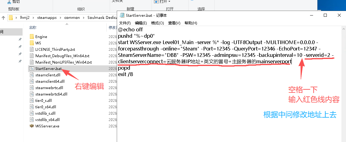 -serverid=2 -clientserverconnect=云服务器IP地址+英文的冒号+主服务器的mainserverport