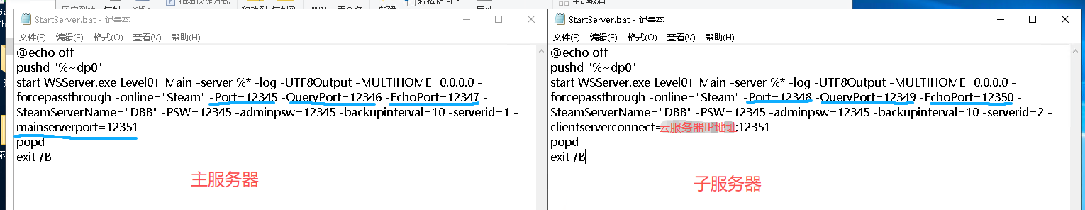 注意:两个游戏服务器如果是搭建在同一个云服务器里,那么启动脚本的三个端口Port、QueryPort、EchoPort就要注意不要重复了